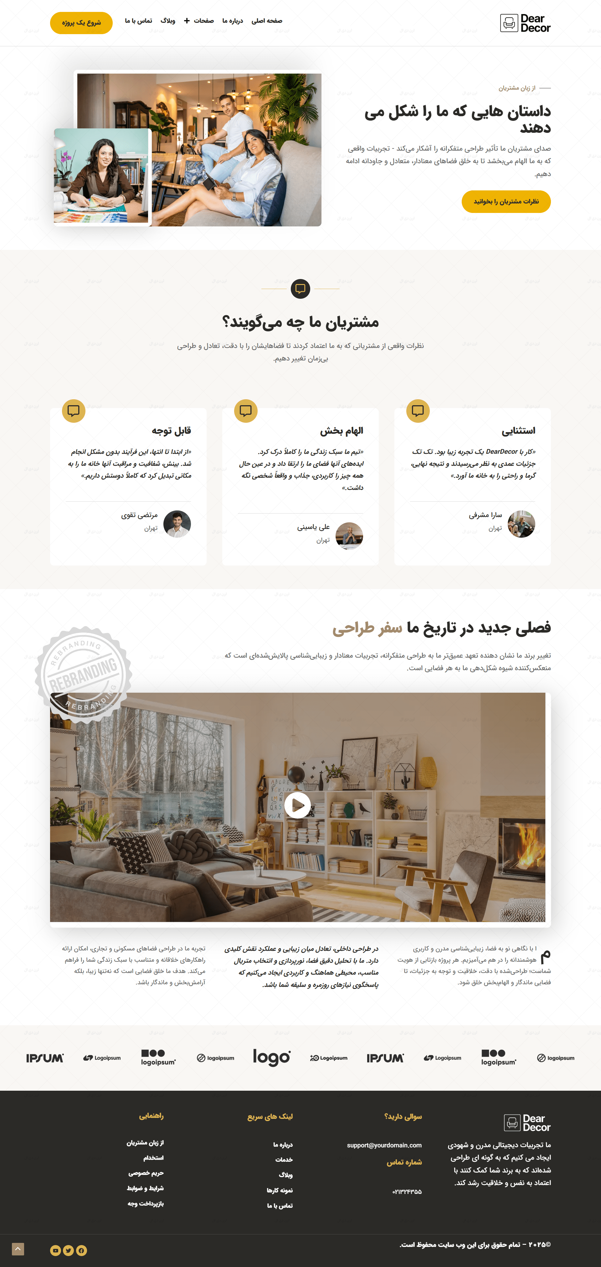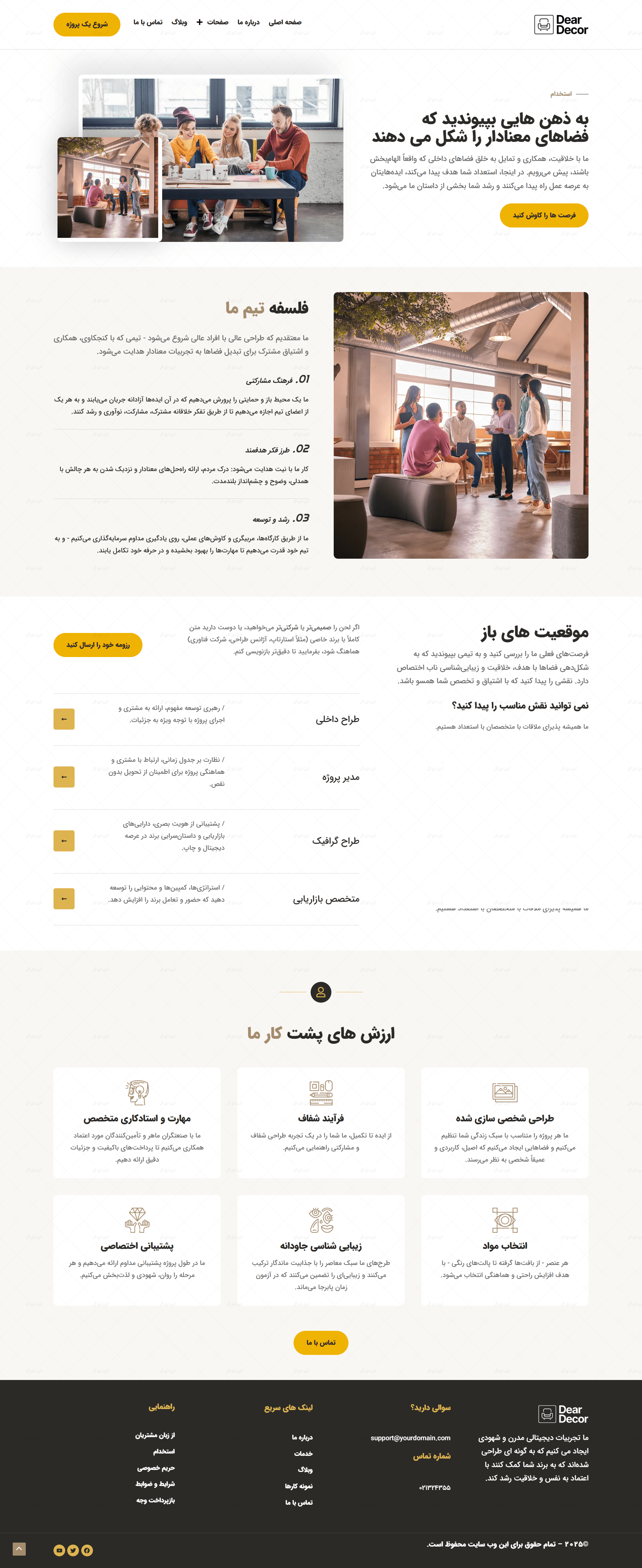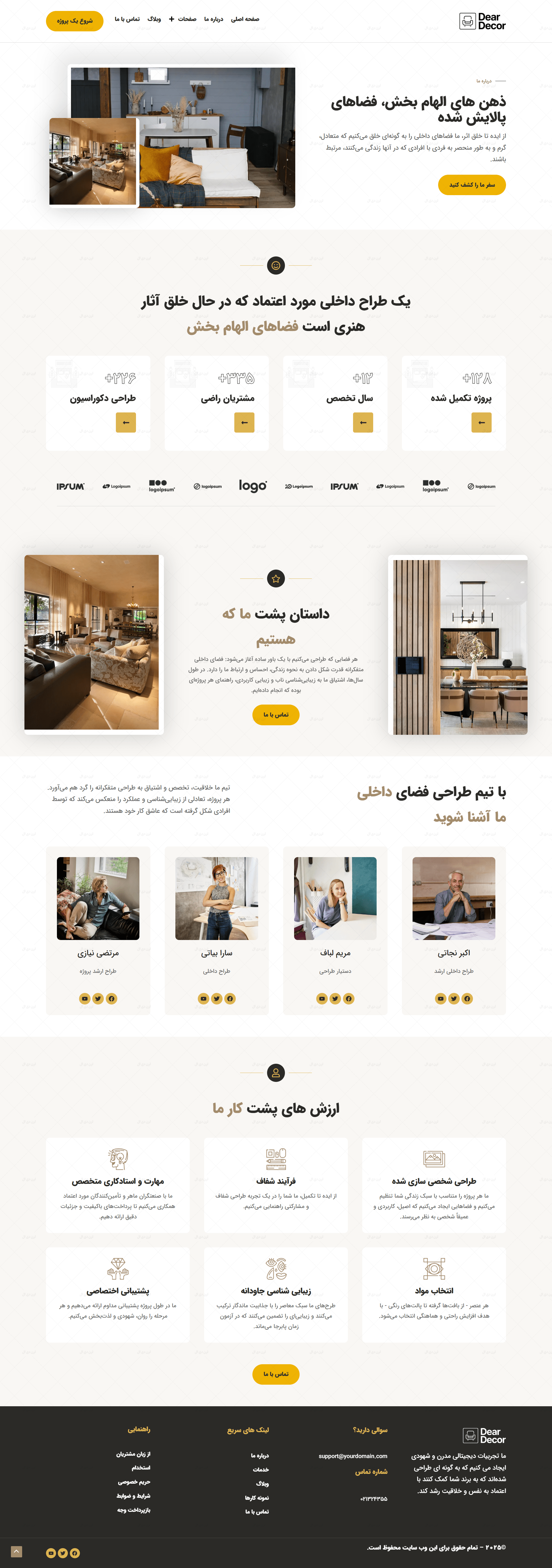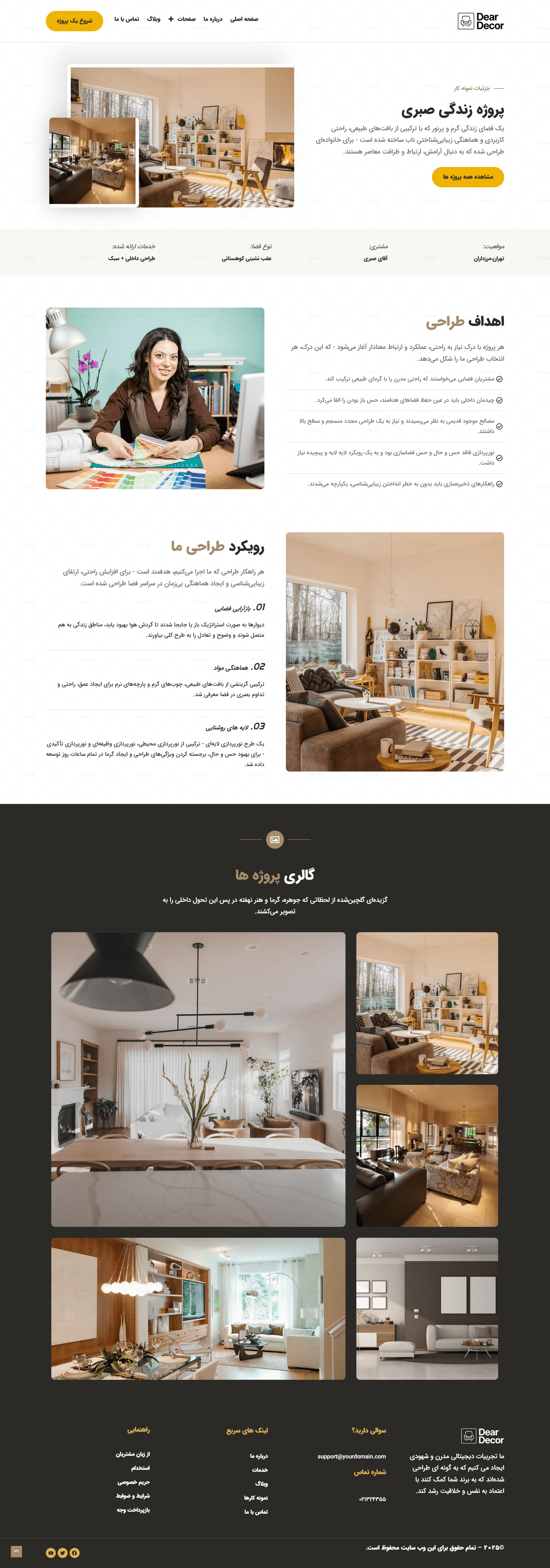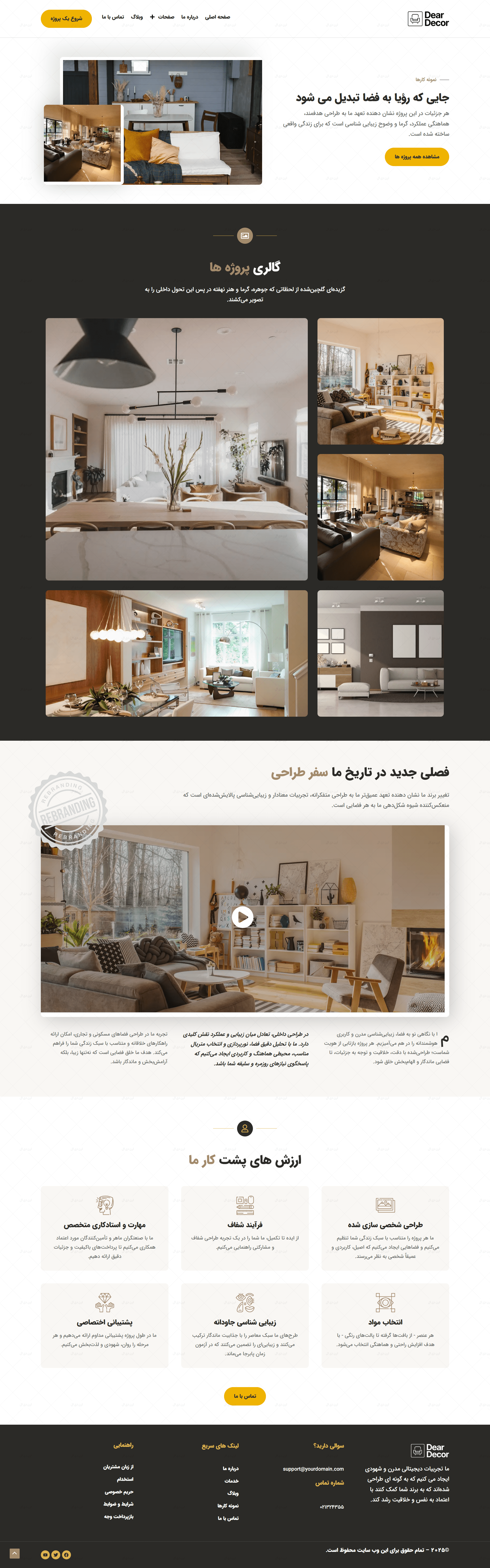 طراحی گرافیکی این سایت کاملاً متناسب با حوزه دکوراسیون داخلی انجام شده است؛ استفاده از فضاهای سفید، فونت ایرانی و ساختار مینیمال کمک میکند تا تصاویر پروژه ها و نمونه کارها بیشترین تأثیر بصری را روی مخاطب بگذارند. صفحات مهمی مانند معرفی شرکت، خدمات، نمونه کارها، درباره ما، تماس با ما و بخش بلاگ به صورت استاندارد و از پیش طراحی شده اند تا در کمترین زمان، سایت شما آماده بهره برداری باشد.