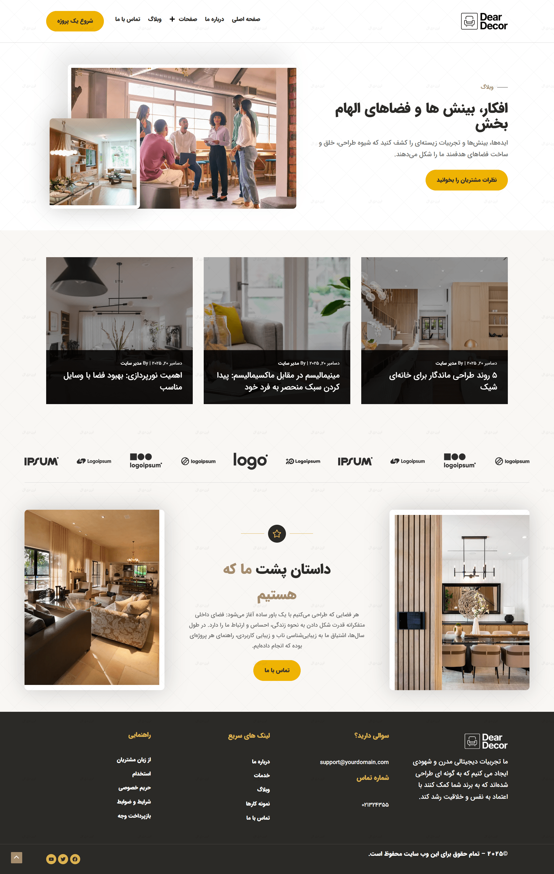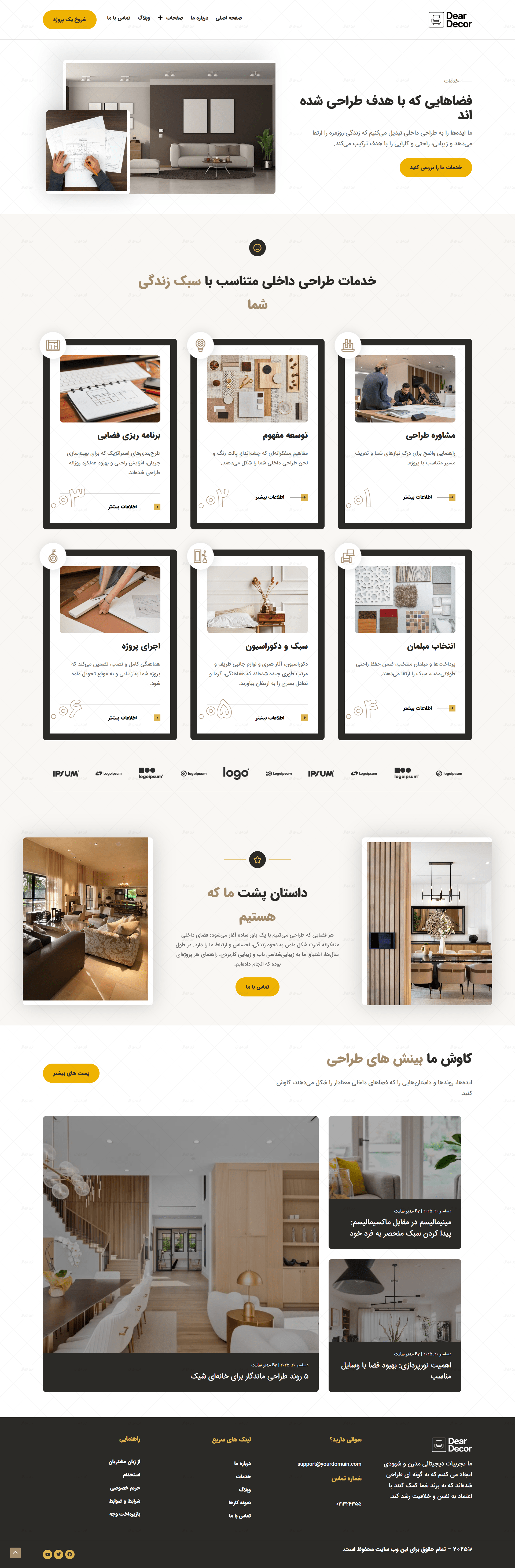 در دنیای رقابتی امروز، داشتن یک وب سایت حرفه ای و ساختارمند برای شرکت های طراحی دکوراسیون داخلی، نه تنها یک مزیت، بلکه یک ضرورت محسوب میشود. سایت آماده وردپرسی شرکت طراحی دکوراسیون داخلی که بهصورت اختصاصی توسط تیم لرن دی ال طراحی شده، دقیقاً با همین هدف توسعه یافته است؛ یعنی ارائه یک راهکار سریع، زیبا و کاملاً کاربردی برای معرفی خدمات، نمونه کارها و هویت بصری برند شما است.