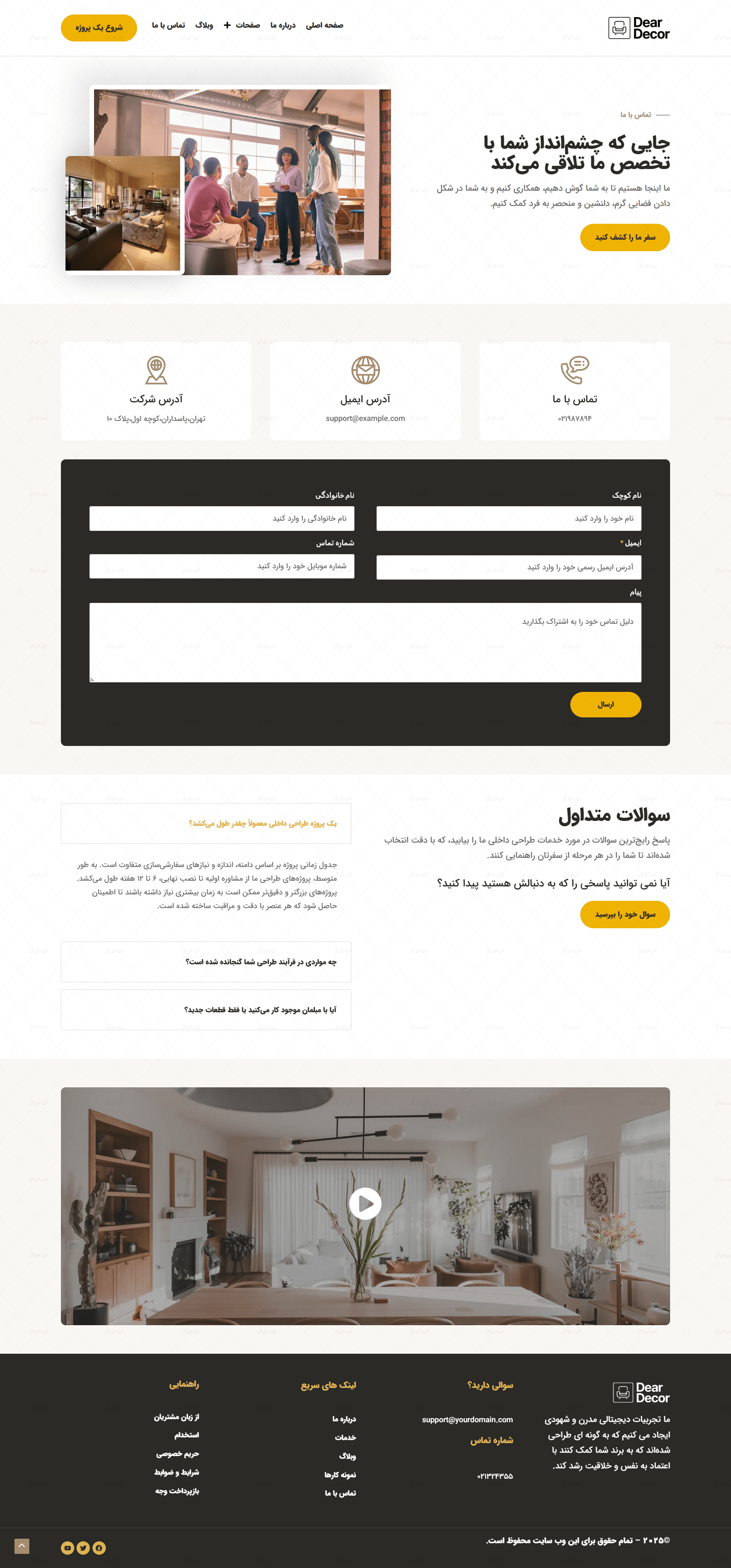 سایت آماده وردپرسی شرکت طراحی دکوراسیون داخلی، یک وب سایت حرفه ای، سریع و قابل ویرایش است که با وردپرس، قالب آسترا و المنتور به صورت اختصاصی توسط تیم ما طراحی و به صورت بسته نصبی آسان عرضه می شود.